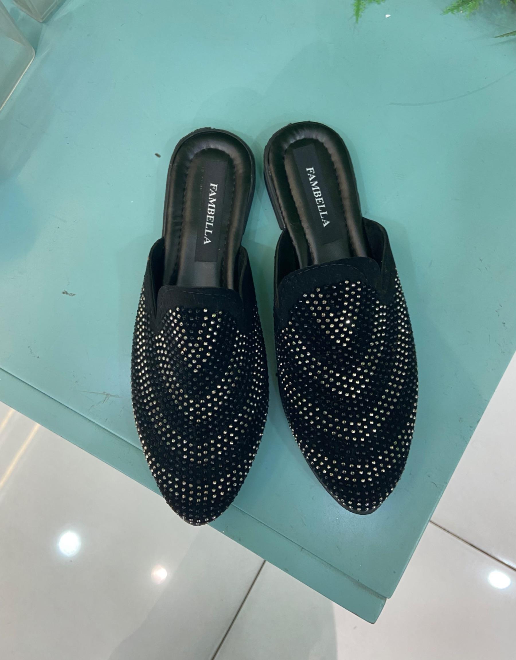 Bayan Siyah Taşlı Allo Oval Burun Taşlı Kadın Terlik | Fambella