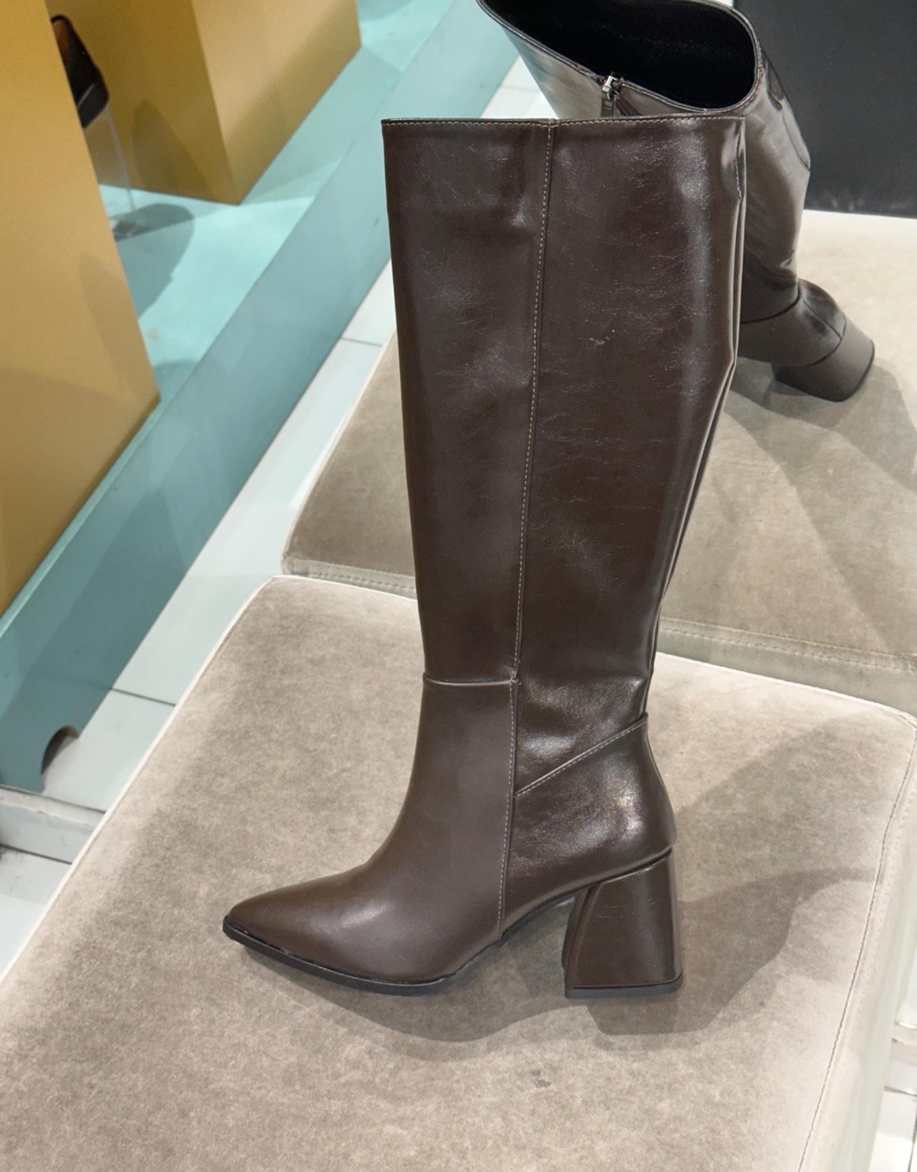 Fotto Sivri Burun Fermuar Detay Kadın Topuklu Çizme Acı Kahve Kırışık
