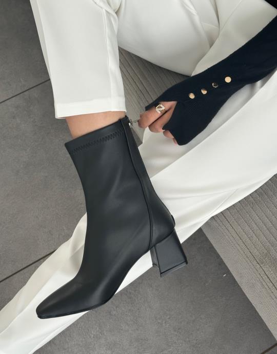 Zarina Küt Burun Fermuar Detay Streç Topuklu Kadın Bot Siyah Deri