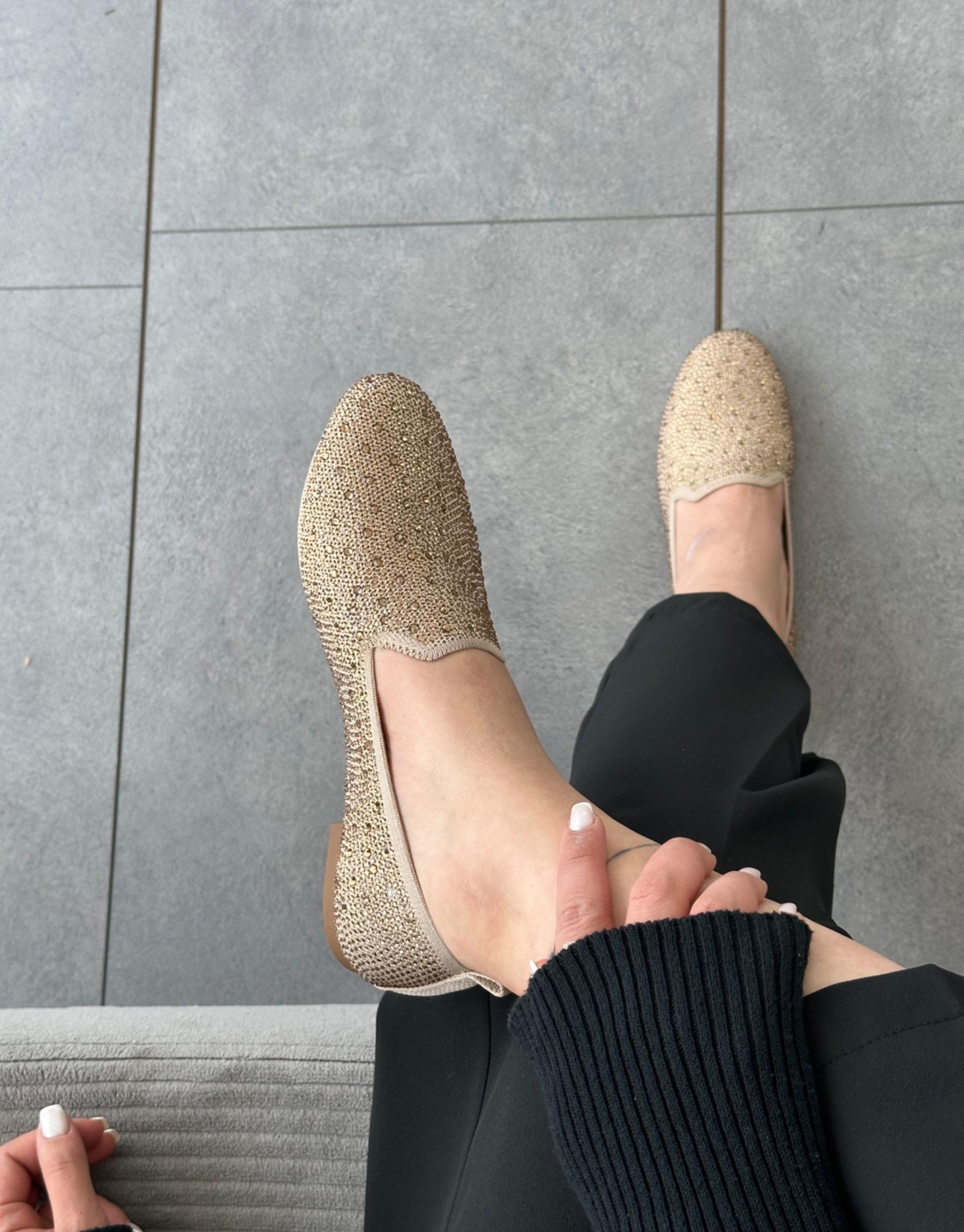 Bayan Bej Akaso Oval Burun Taş Detay Kadın Triko Babet | Fambella