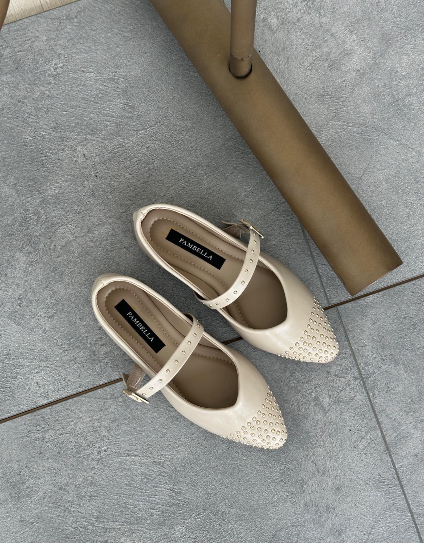 Bayan Bej Besar Sivri Burun Ön Trok Taş Detay Kemerli Kadın Babet | Fambella