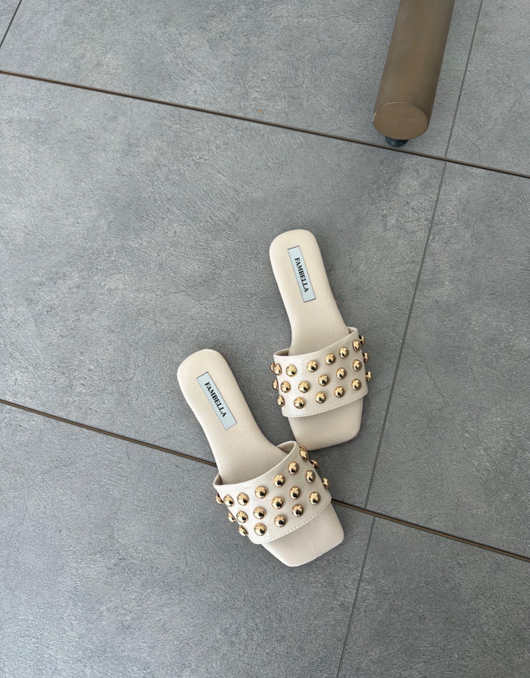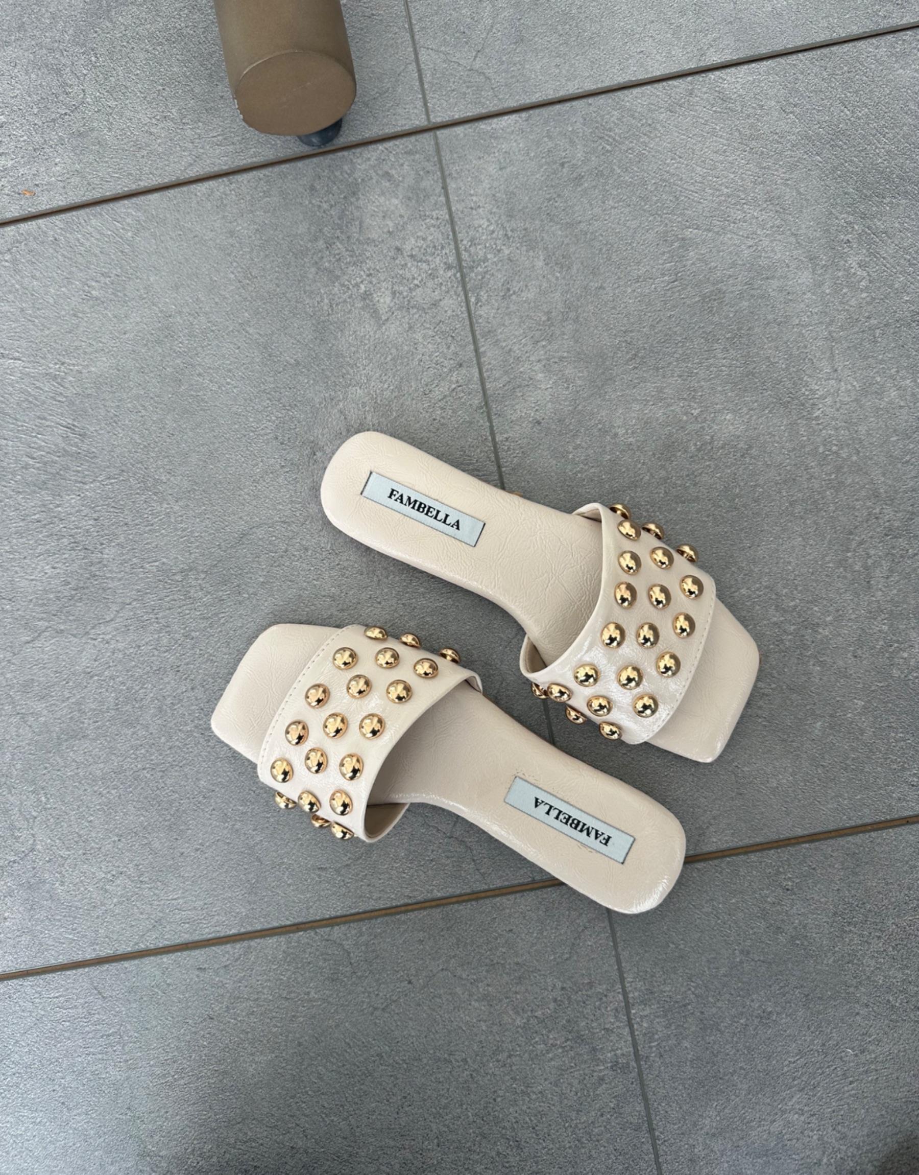 Bayan Bej Marten Ön ve Arkası Açık Boncuk Aksesuar Detay Kadın Terlik | Fambella