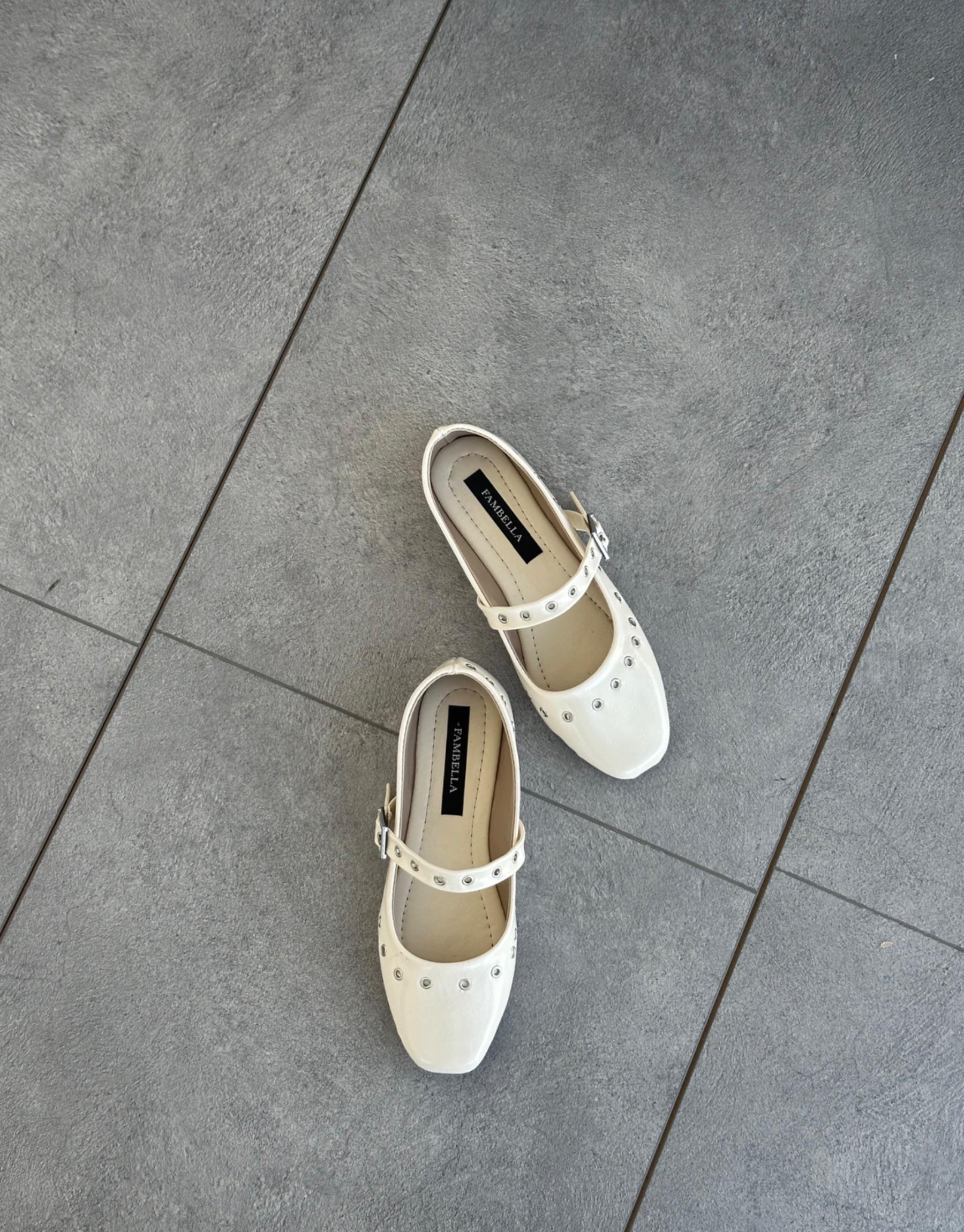 Bayan Beyaz Kırışık Rugan Harov Oval Burun Trok Detay Kemerli Kadın Babet | Fambella