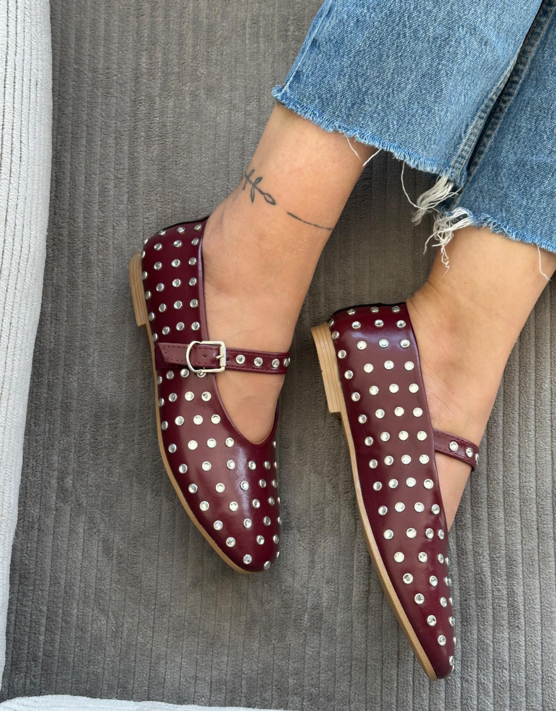 Paney Yuvarlak Burun Atkı Detay Kadın Babet Bordo Kırışık