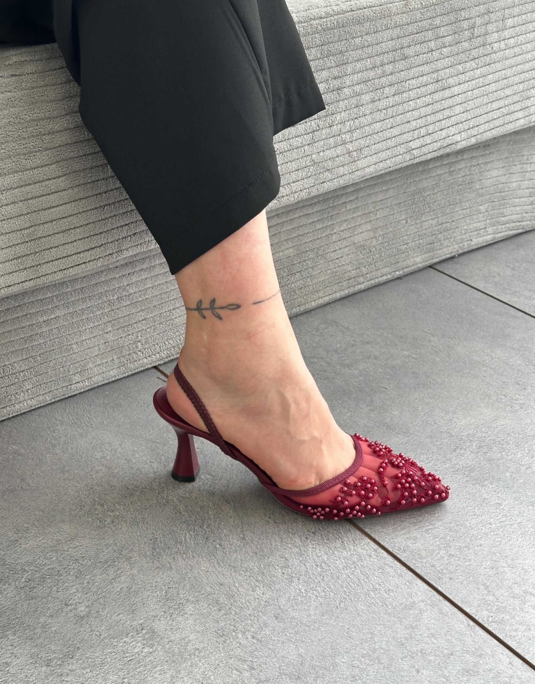 Bayan Bordo Liny Oval Burun File Taş Detay Arkası Açık Lastikli Kadın Topuklu Ayakkabı | Fambella