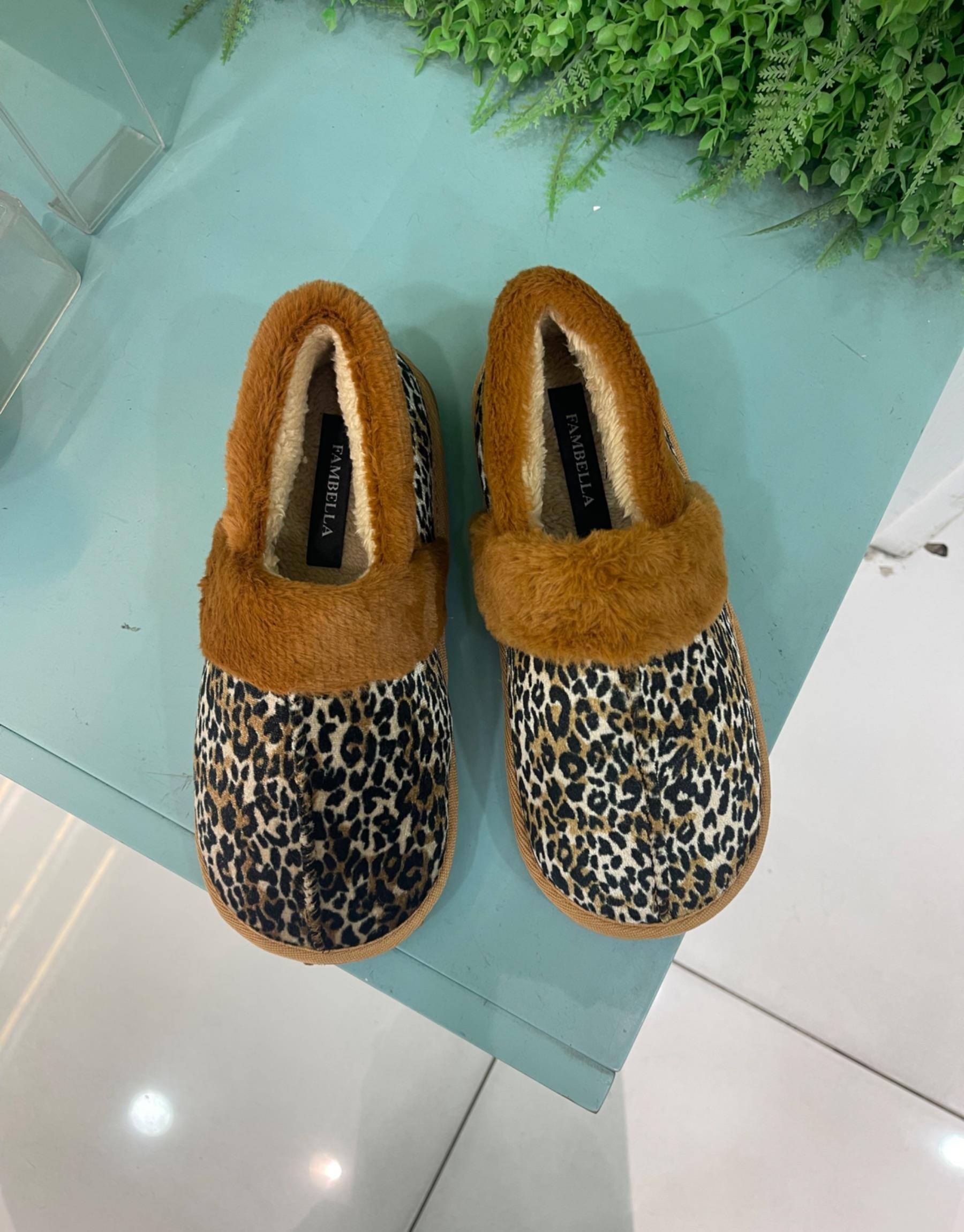 Bayan Leopar Alle Oval Burun Arkası Kapalı Tüylü Kadın Ev Terliği | Fambella