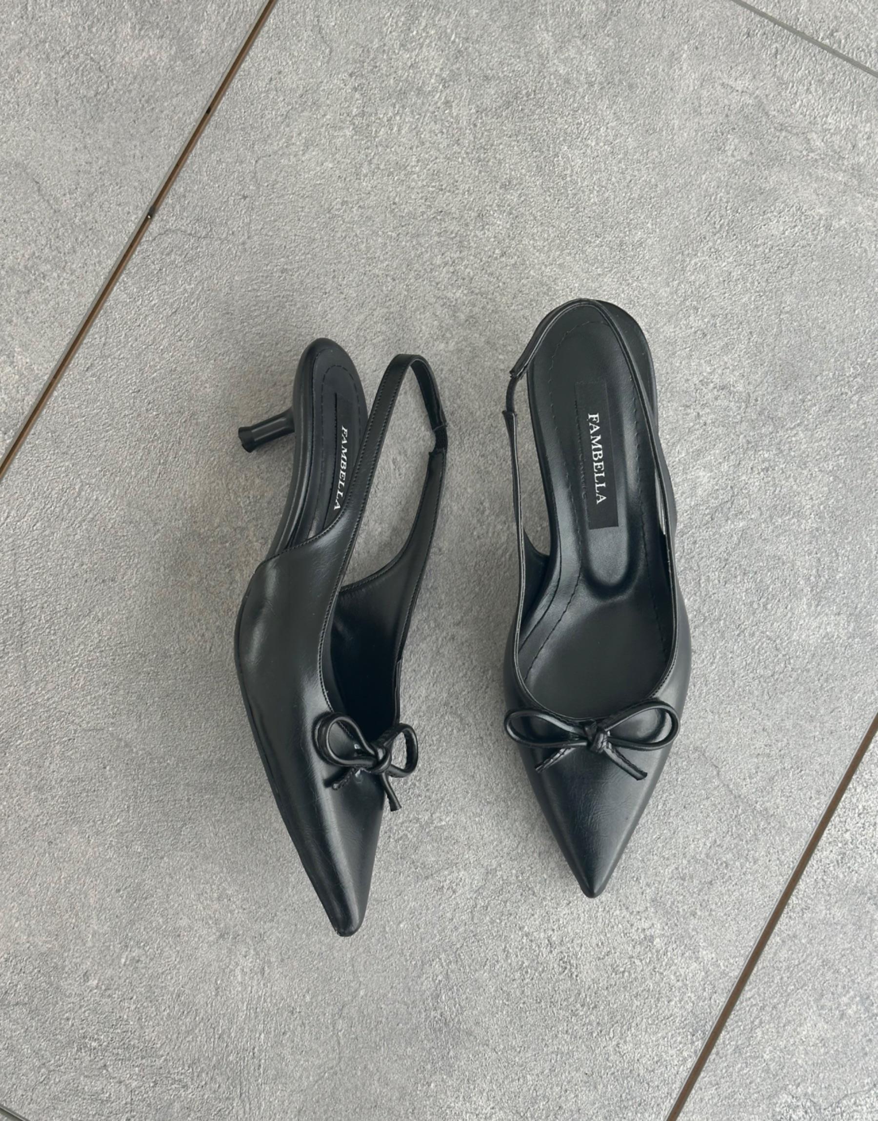 Zakaria Sivri Burun Ön Fiyonk Detay Arkası Açık Kemerli Kadın Topuklu Ayakkabı Siyah Rugan