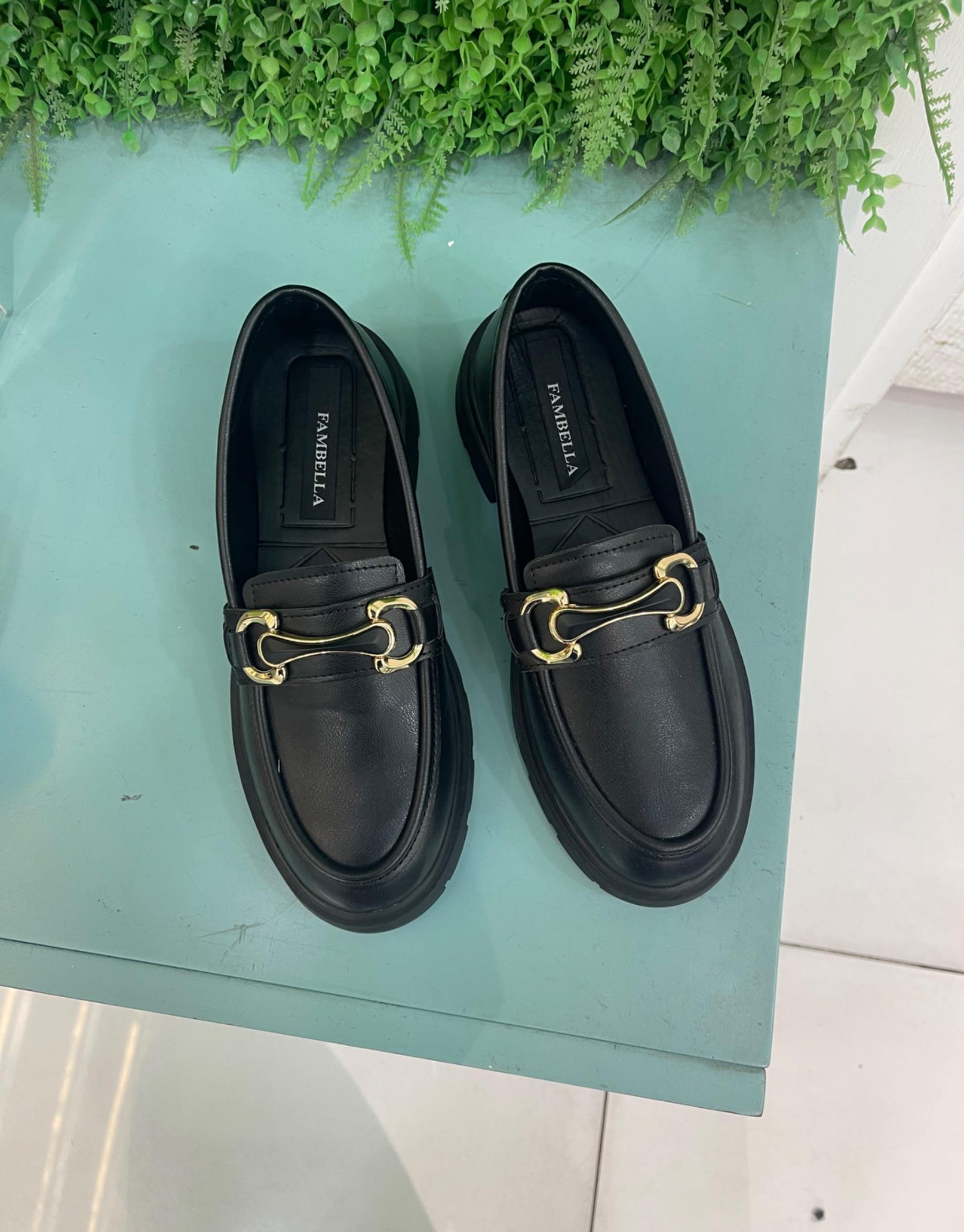 Bayan Siyah Deri Barcelona Kalın Taban Oval Burun Ön Aksesuar Detay Kadın Loafer | Fambella