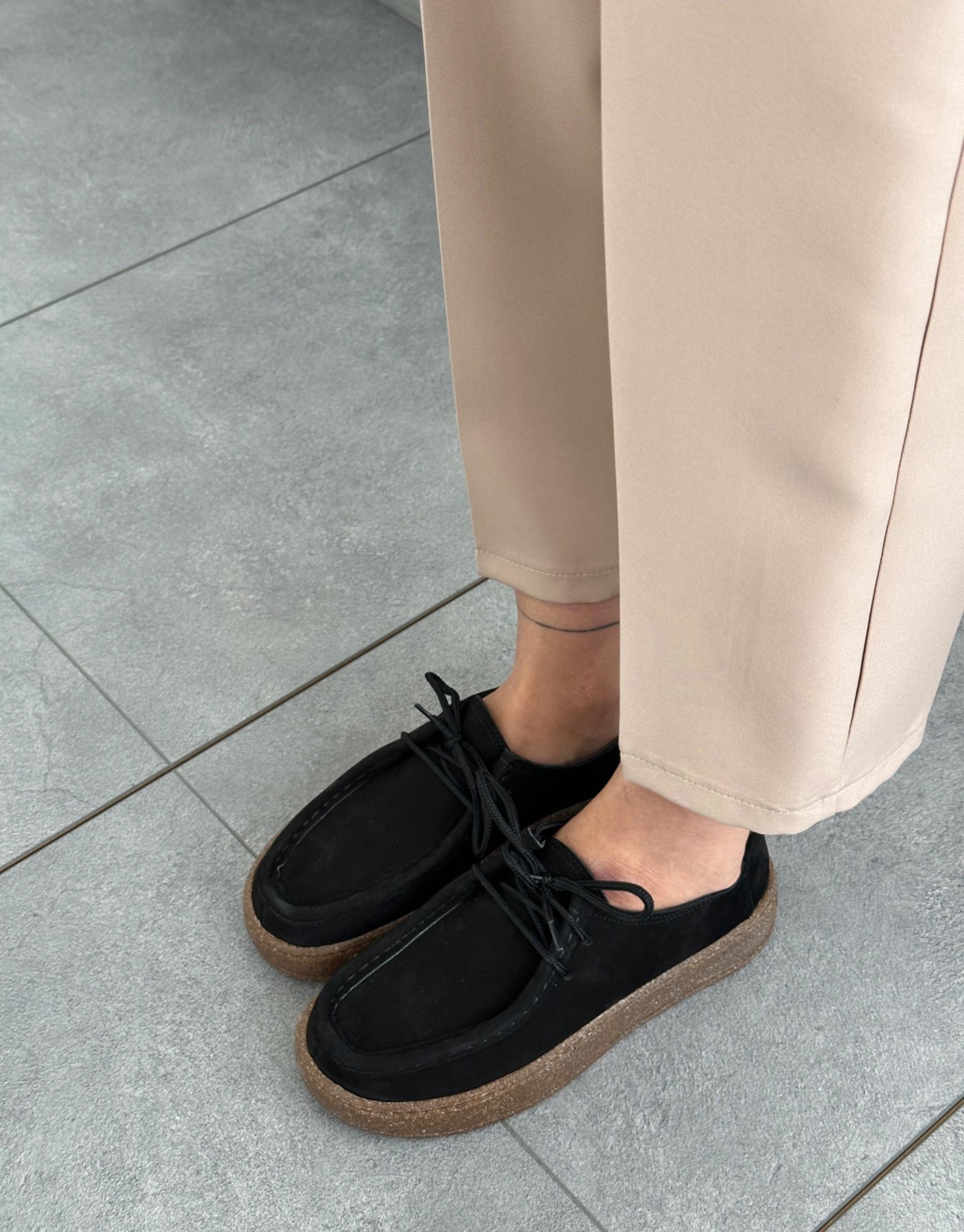 Bayan Siyah Deri Javed Oval Burun Kalın Taban Bağcıklı Kadın Hakiki Deri Loafer | Fambella