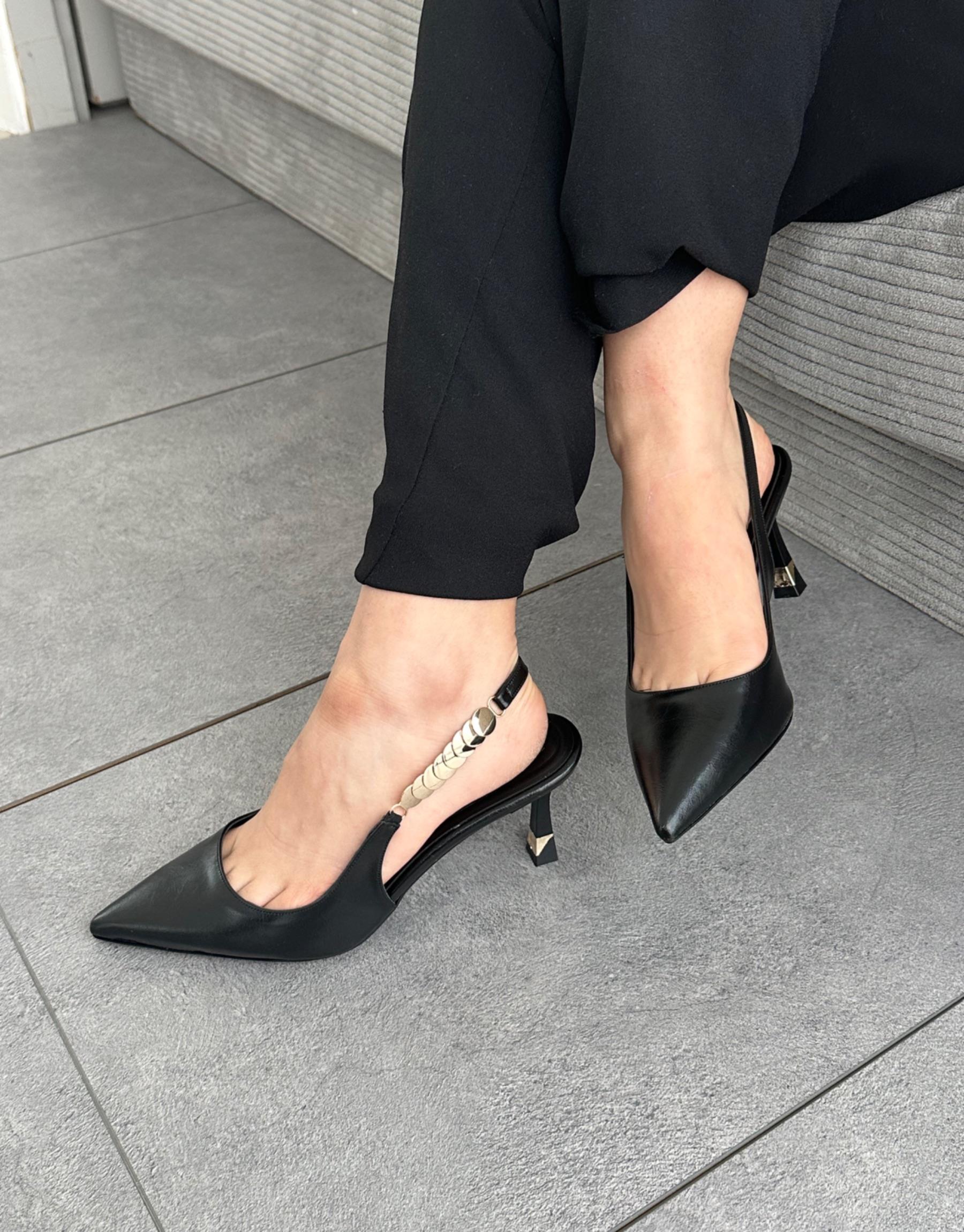 Bayan Siyah Doli Sivri Burun Kemer Aksesuar Detay Arkası Açık Kadın Topuklu Ayakkabı | Fambella