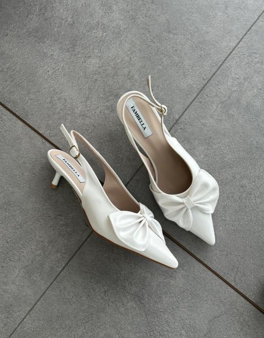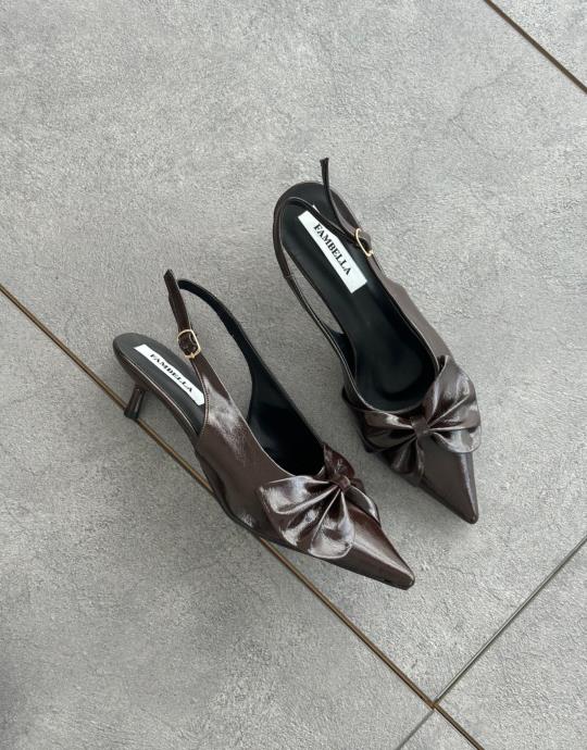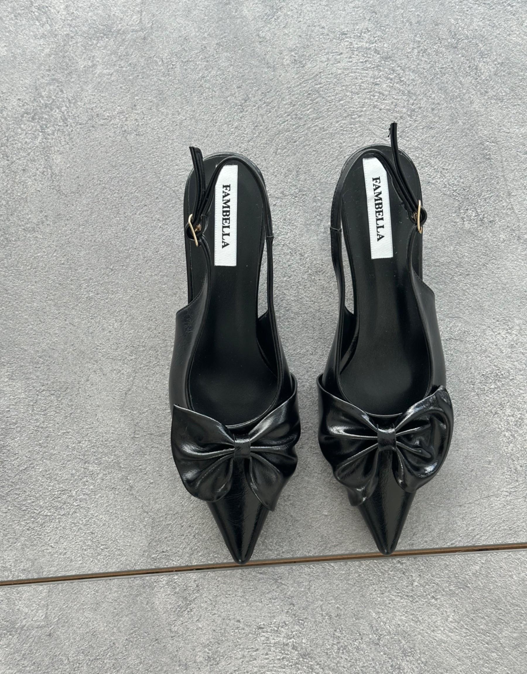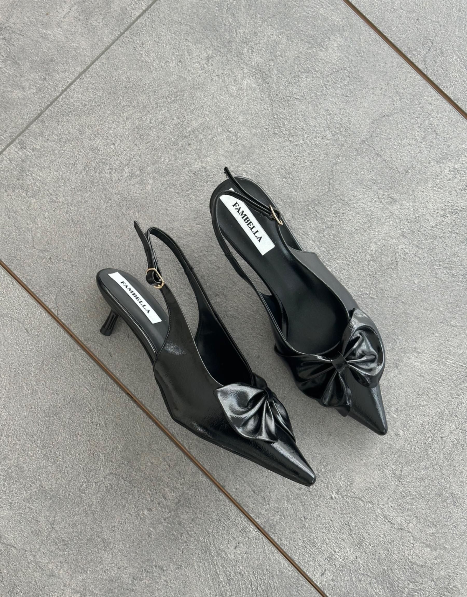 Bayan Siyah Rugan Zakaria Sivri Burun Ön Fiyonk Detay Arkası Açık Kemerli Kadın Topuklu Ayakkabı | Fambella