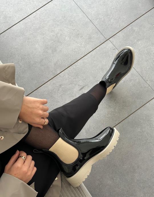 Seoul Yuvarlak Burun Lastikli Yağmur Botu Siyaha Bej