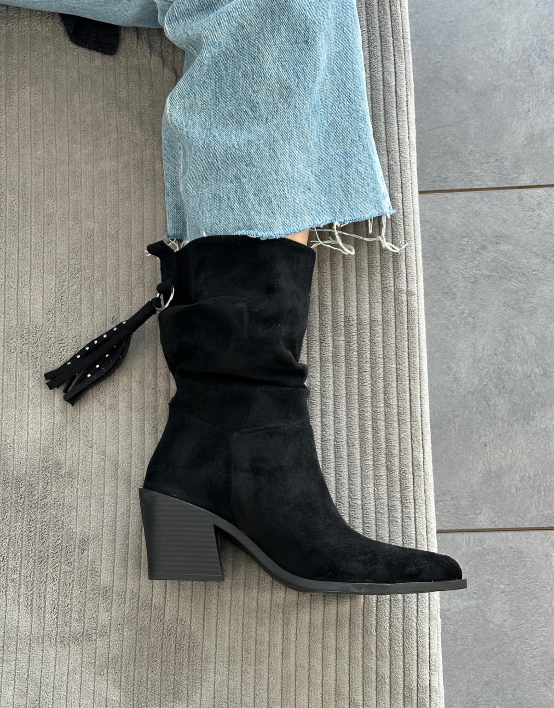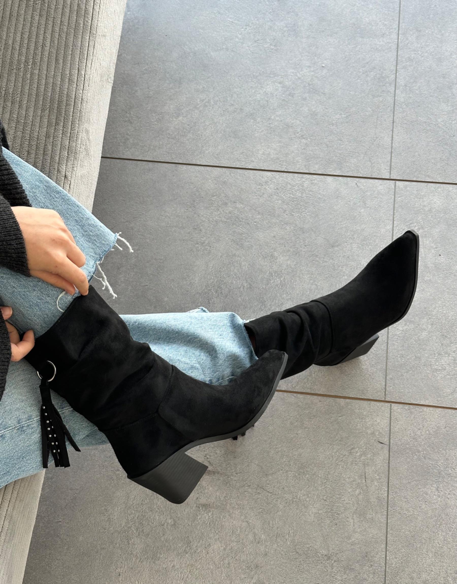 Bayan Siyah Süet Wati Sivri Burun Arka Aksesuar Detay Kadın Topuklu Süet Bot | Fambella