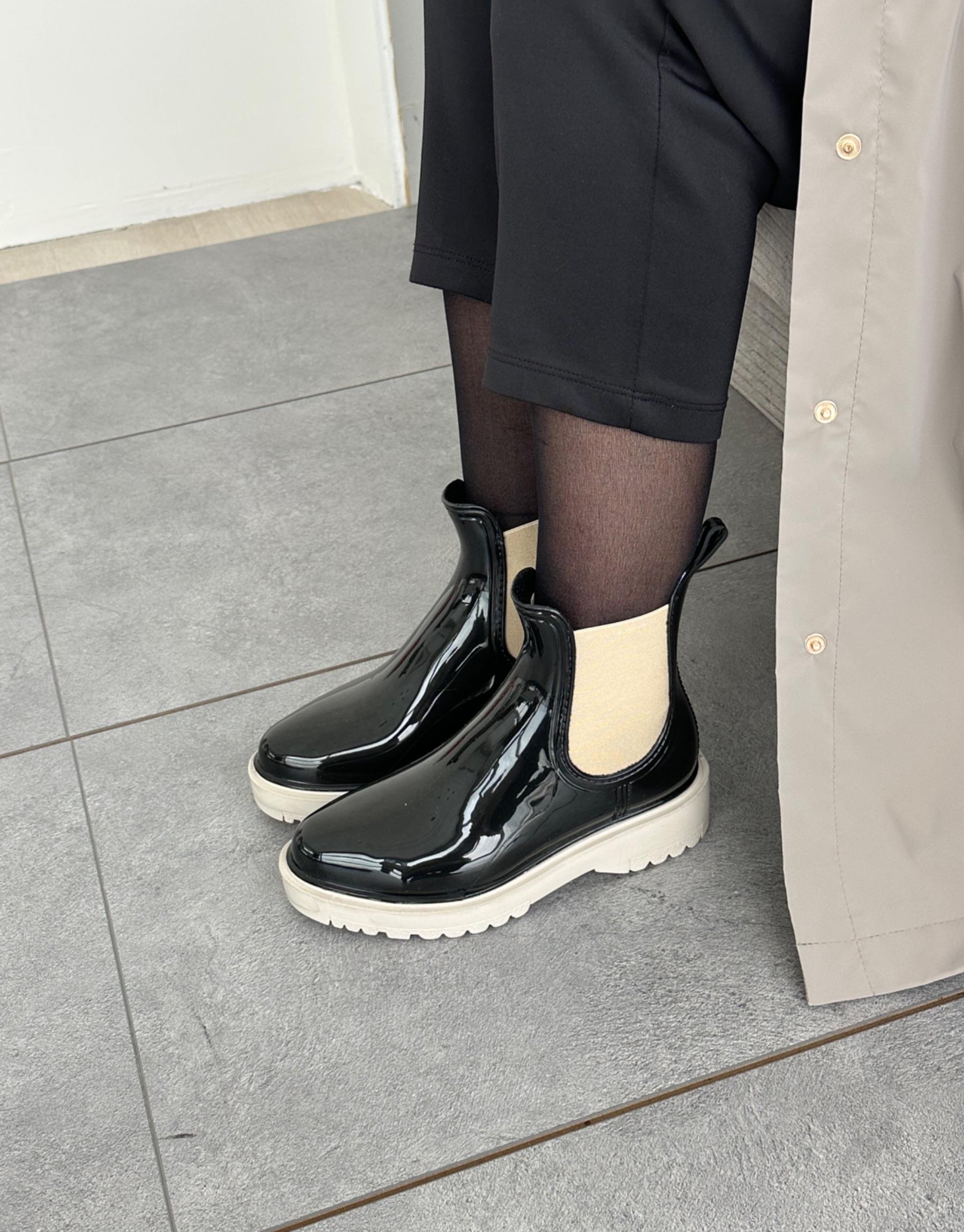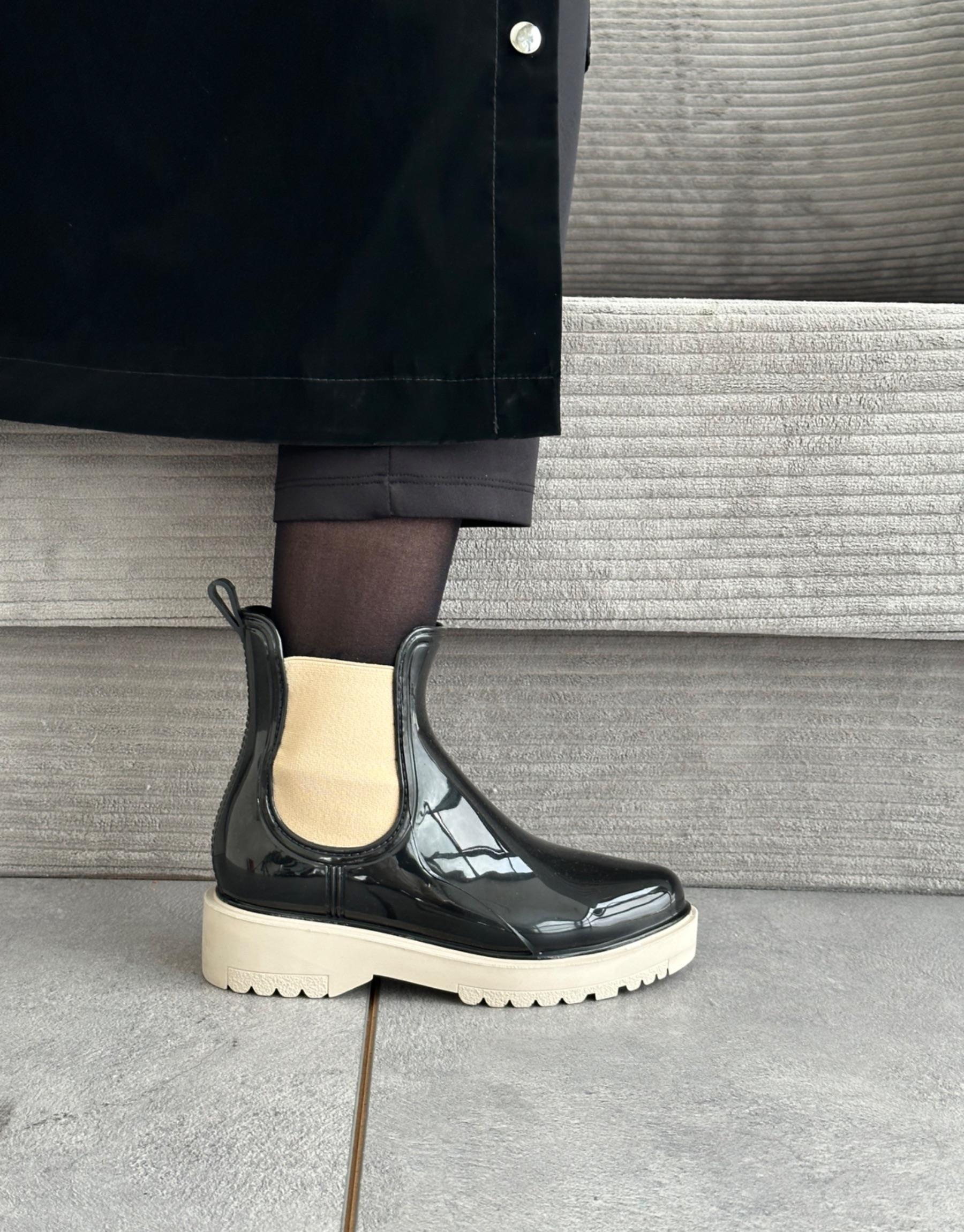 Bayan Siyaha Bej Seoul Yuvarlak Burun Lastikli Yağmur Botu | Fambella