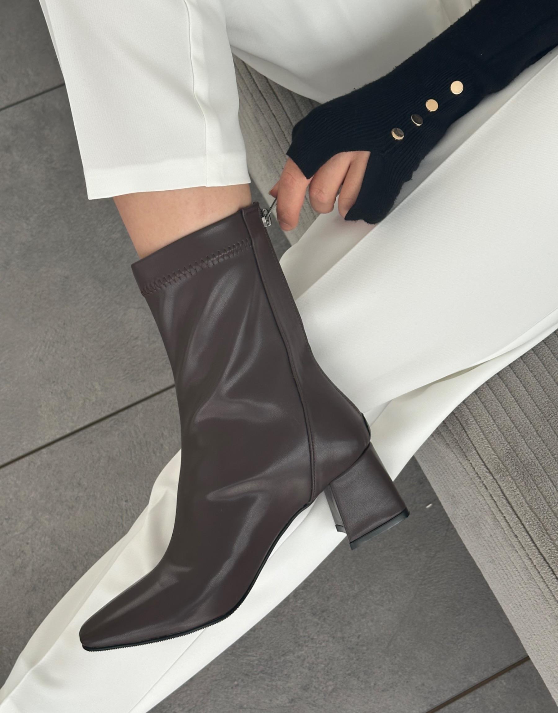 Bayan Acı Kahve Deri Zarina Küt Burun Fermuar Detay Streç Topuklu Kadın Bot | Fambella