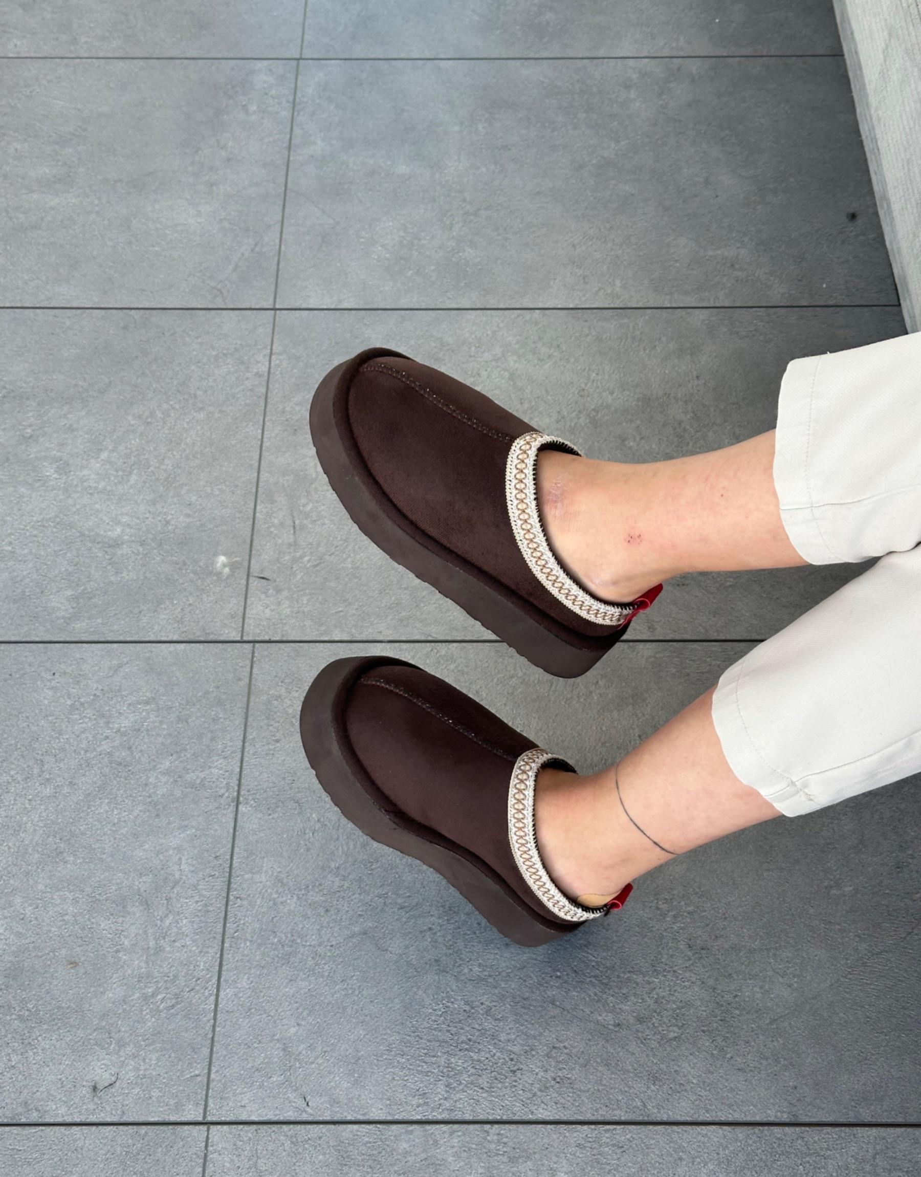 Bayan Acı Kahve Stockholm Düz Taban Oval Burun İçi Kürklü Kadın Bot | Fambella