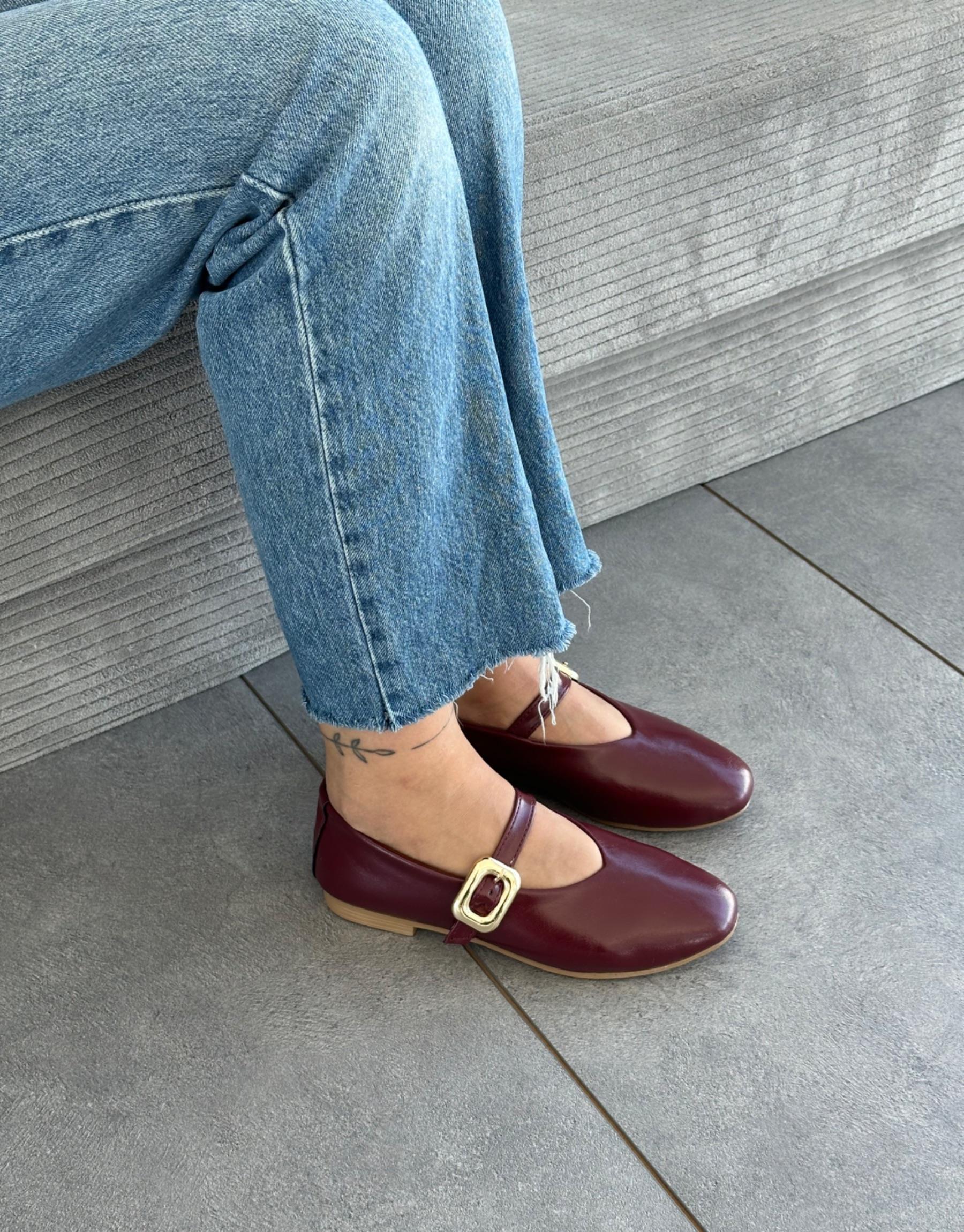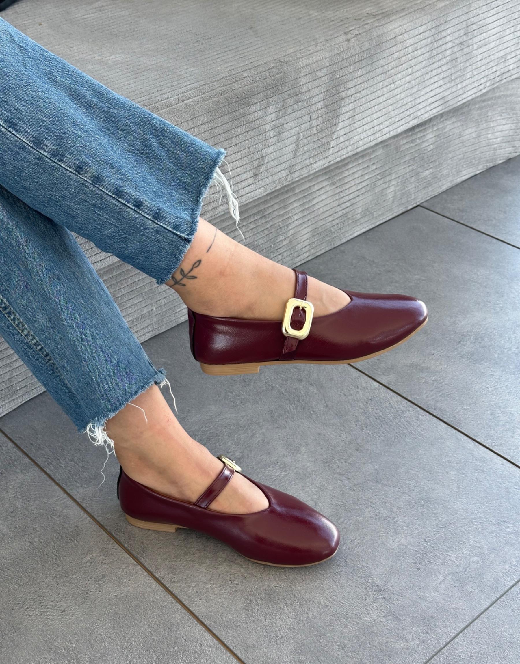 Bayan Bordo Henna Oval Burun Kemer Detay Kadın Babet | Fambella