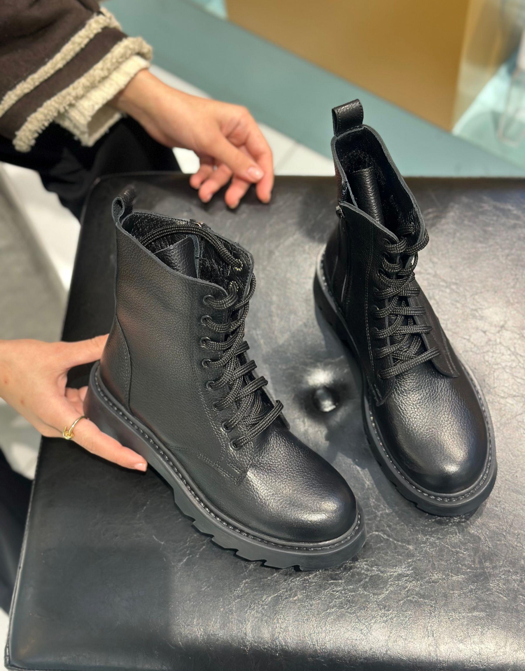 Bayan Siyah Deri Gittens Kalın Taban Oval Burun Bağcıklı Hakiki Deri Kadın Postal | Fambella