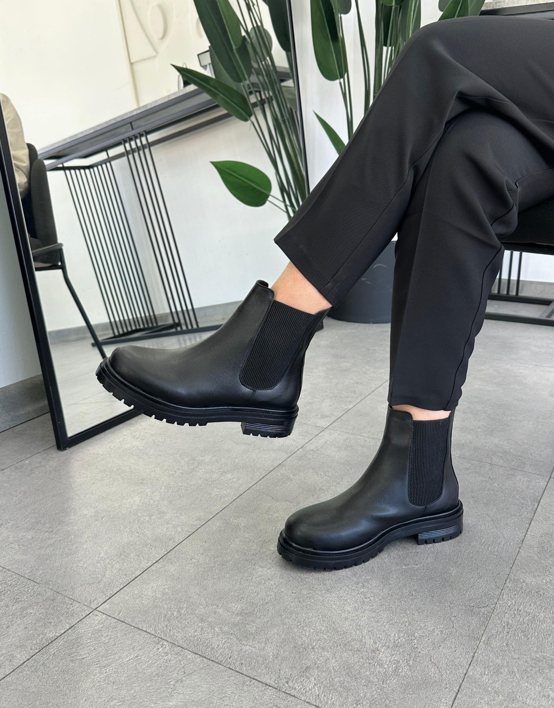 Rezza Yuvarlak Burun Bağcıklı Kadın Postal Siyah Deri