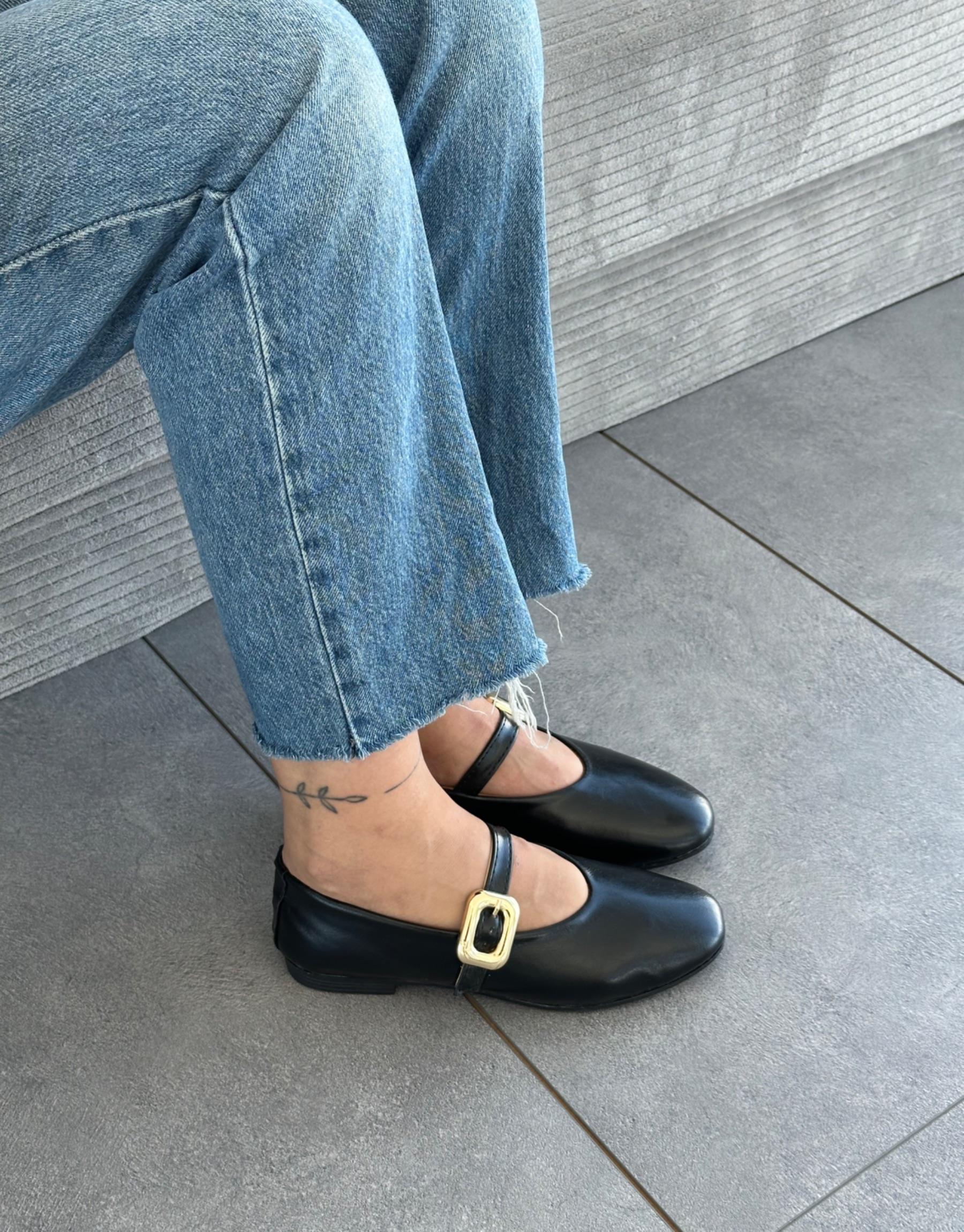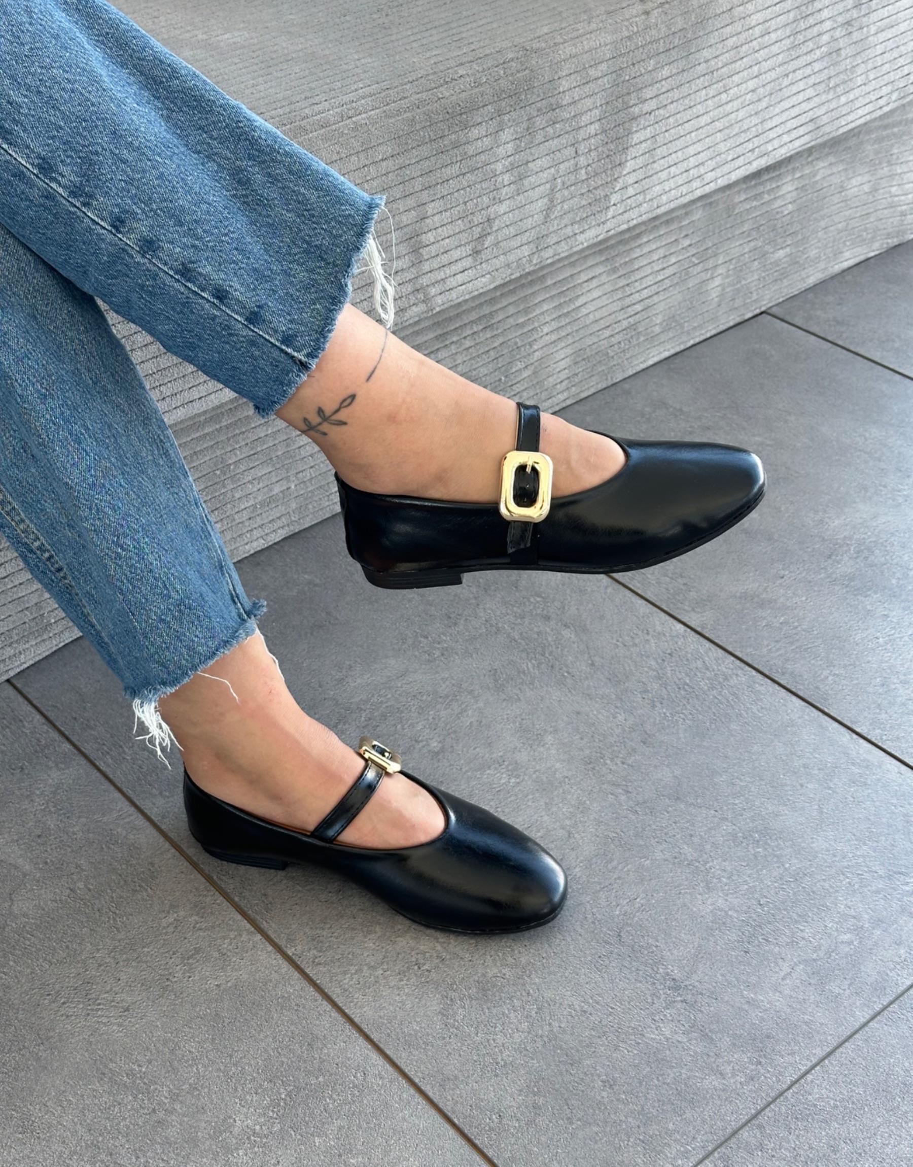 Bayan Siyah Henna Oval Burun Kemer Detay Kadın Babet | Fambella