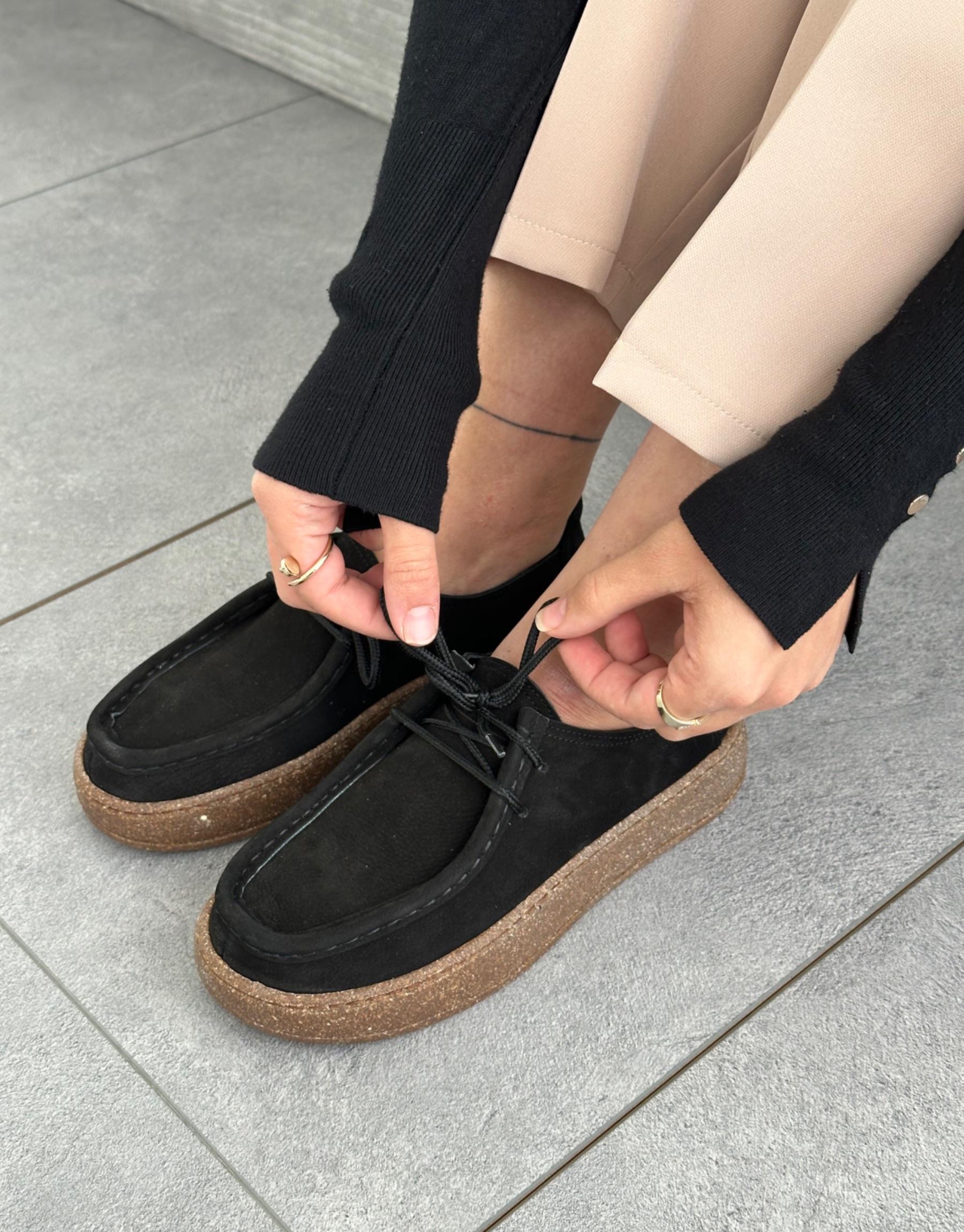 Bayan Siyah Deri Javed Oval Burun Kalın Taban Bağcıklı Kadın Hakiki Deri Loafer | Fambella